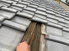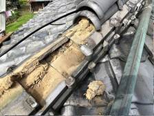 屋根の頂上部分にある棟瓦は、強風で崩れたり内部の葺き土が流れ出ることがあります。見た目では分かりづらいですが、ここからの雨水侵入も非常に多いパターンです。